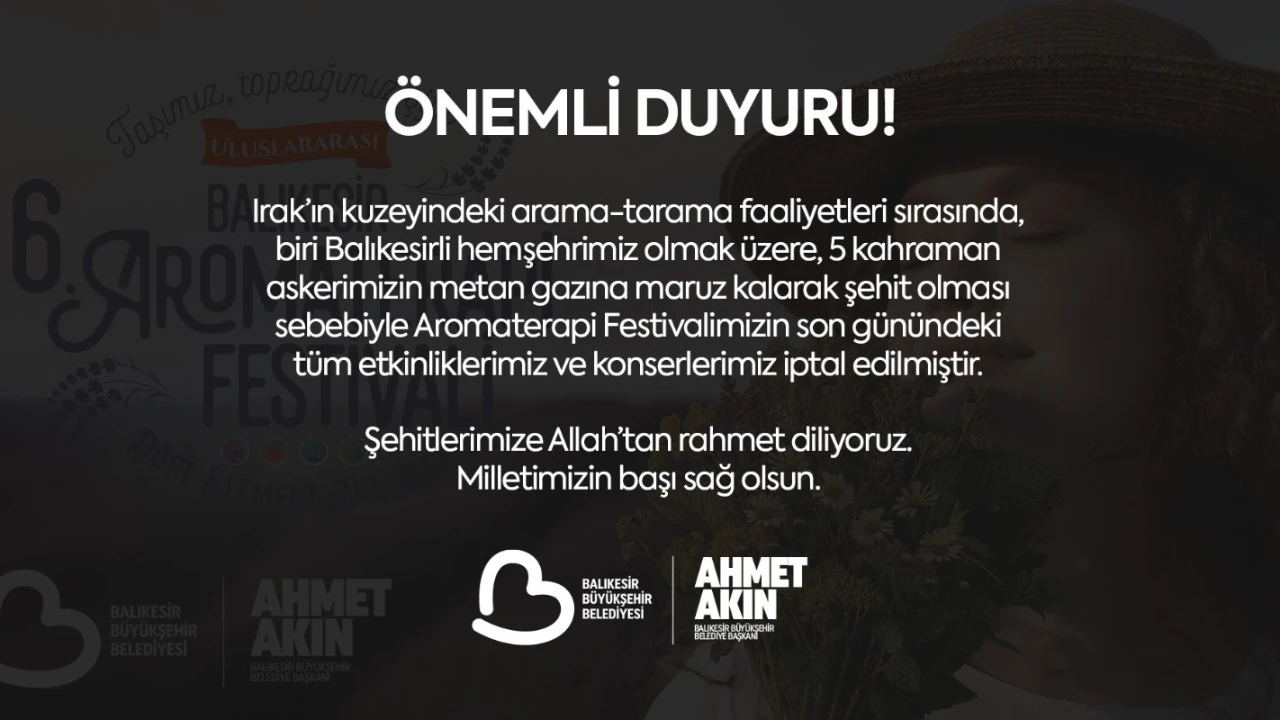 Büyükşehir Belediyesinden yapılan duyuruda, Irak'ın kuzeyindeki arama tarama faaliyetleri sırasında, biri Balıkesirli olmak üzere 5 kahraman askerin şehit olduğu belirtilerek, "Bu nedenle Aromaterapi Festivali'mizin son günündeki tüm etkinliklerimiz ve konserlerimiz iptal edilmiştir. Şehitlerimize Allah'tan rahmet diliyoruz. Milletimizin başı sağ olsun" ifadesi kullanıldı.