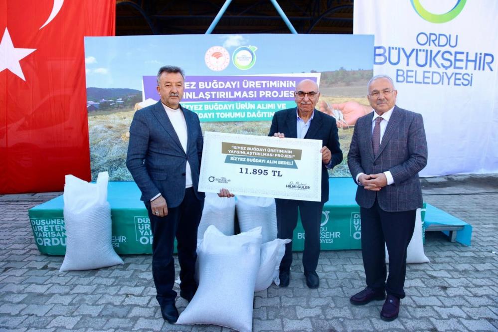 Ordu Büyükşehir Belediye Başkanı Dr. Mehmet Hilmi Güler'in "nitelikli tarım" projesi kapsamında atıl arazilerin tarıma kazandırılması amacıyla üretimine 4 yıl önce başlanan siyez buğdayında çiftçilerden peşin ödemeli alımlar başladı.