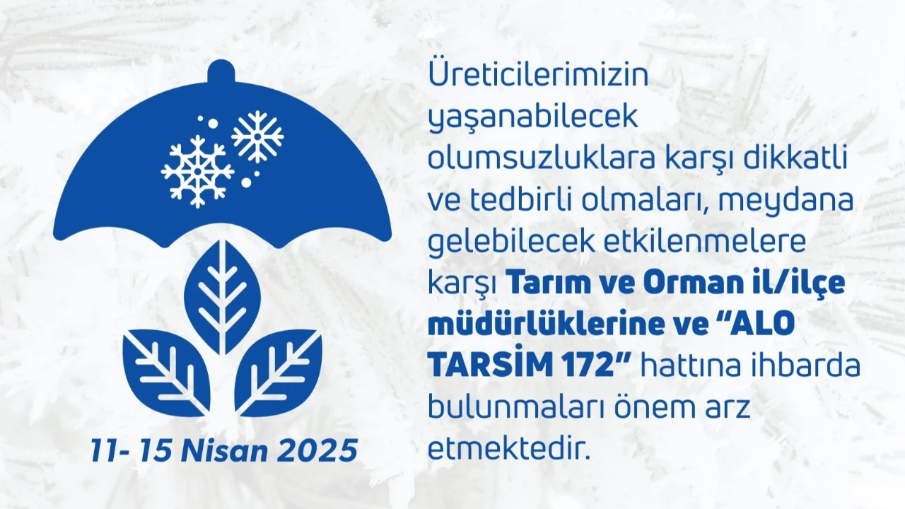 Tarımsal faaliyetlerle uğraşan üreticilerin, çiftçilerin, zirai don, dolu, aşırı yağış, sel, su baskını ve fırtınaya karşı dikkatli ve tedbirli olmalarının önem taşıdığı vurgulanan açıklamada, "Meydana gelebilecek etkilenmelere karşı tarım ve orman il/ilçe müdürlüklerine ve 'Alo Tarsim 172' hattına ihbarda bulunmaları önem arz etmektedir. Bu vesileyle, üreticilerimizin yüzde 70’e varan devlet desteği içeren tarım sigortası yaptırmalarının, bu tür afetlere karşı önemini tekrar hatırlatmak isteriz." ifadesi kullanıldı.