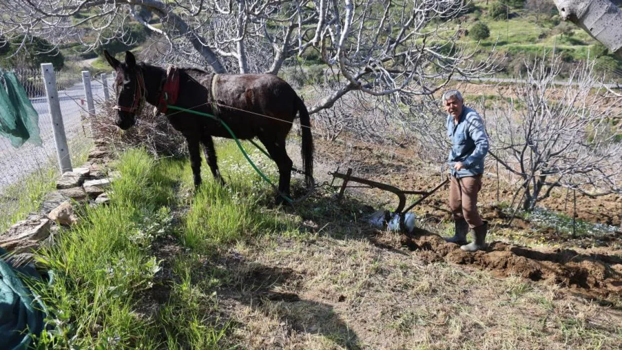 Modern tarım makinelerinin giremediği sarp arazilerde, incir ve asma bahçelerinin bakımı halen at ve katırla bağlanan saban yardımıyla yapılıyor.